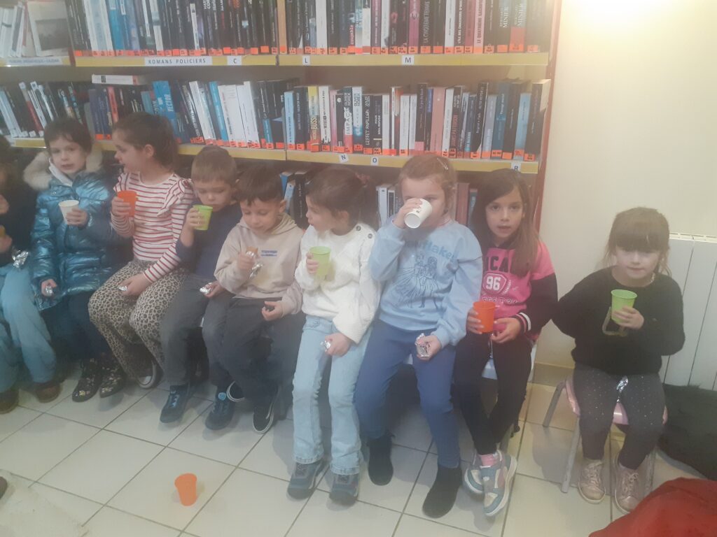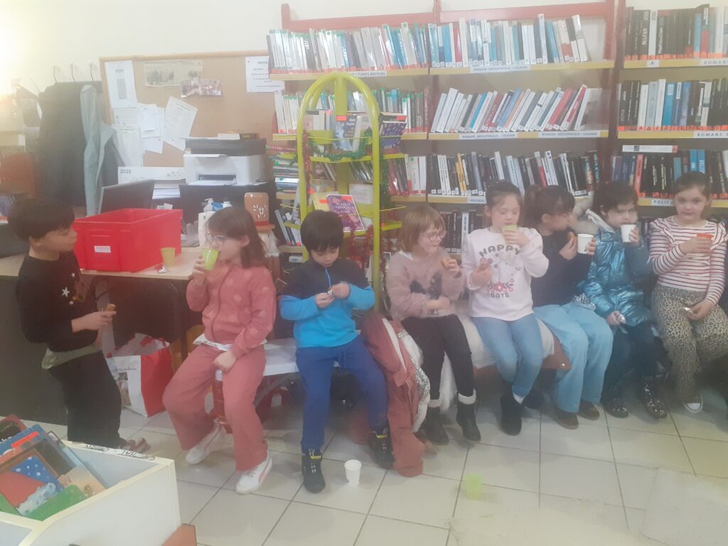 Muriel, responsable de la médiathèque, nous a convié à un goûter de Noël. Les élèves ont pu emprunter chacun un livre, comme à notre habitude. La maîtresse a lu une histoire de Noël: « Adèle n’aime pas Noël ». Enfin, nous avons savouré un délicieux goûter: jus d’orange, gâteau aux pépites de chocolat et un escargot en chocolat.